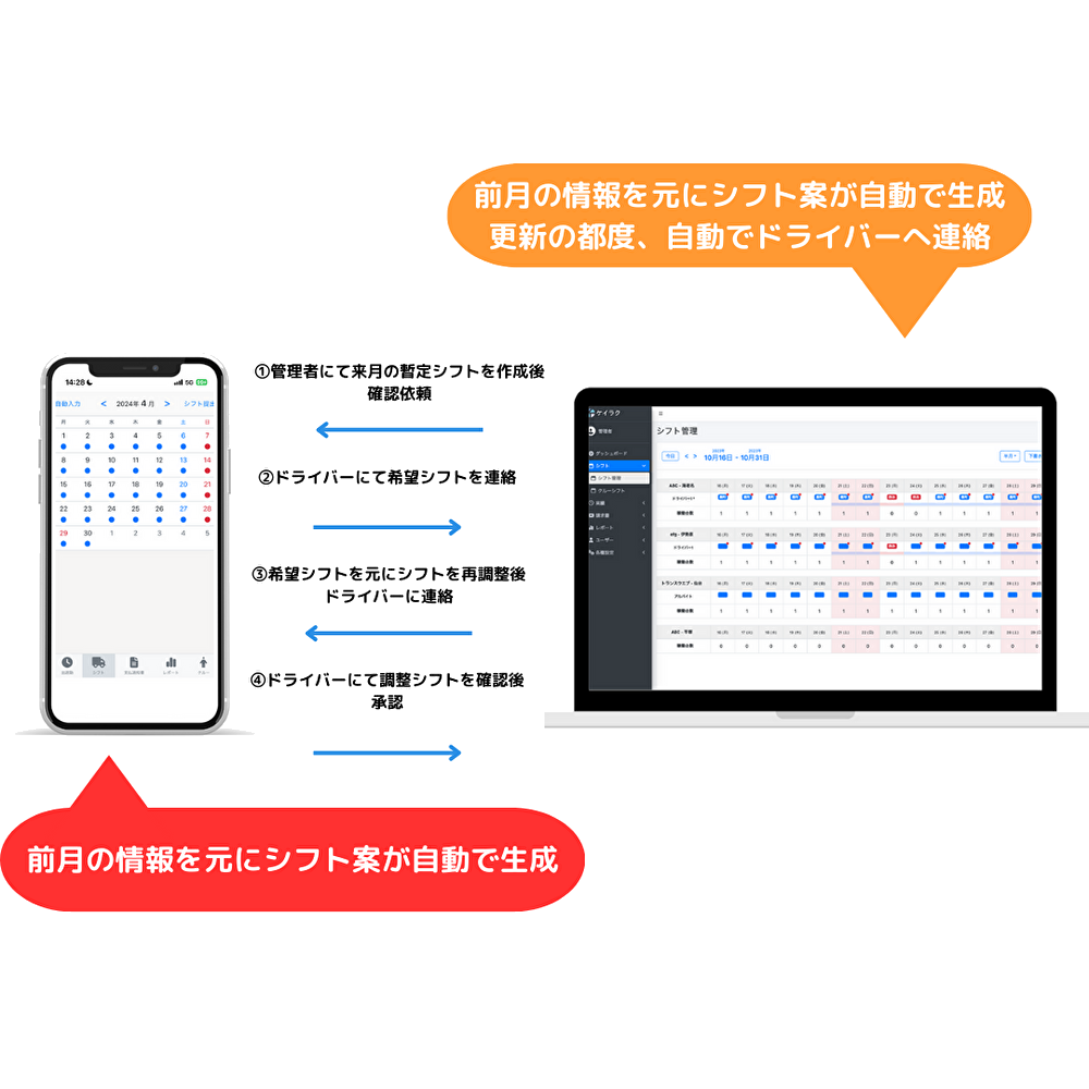 管理者・ドライバー共に前月に提出/作成したシフトをもとに システムが自動的にシフト案を作成してくれます。 この機能により、シフトを考える時間を短縮することが可能です。